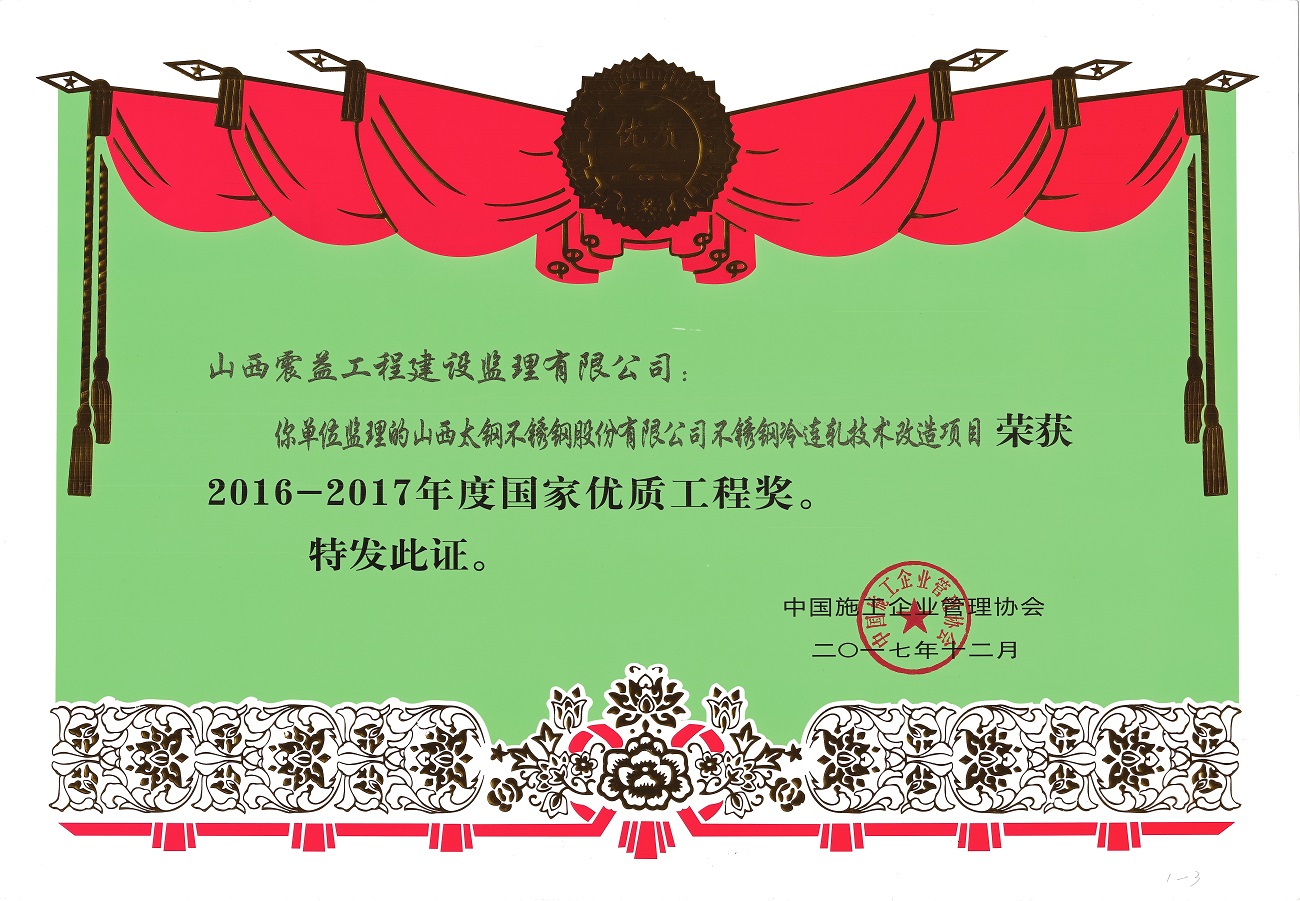 公司先后承擔了冶金、機械、電力、礦山、市政、環保、房屋建筑等工業及民用建設大中型工程項目1000余個,足跡遍及國內二十多個省市,在全國各地四千余個制造廠家進行了駐廠設備監理,工程監理也立足省內輻射全國多個省區乃至國外。多年來,我們憑著嚴格監理、優質服務的工作作風贏得業主的信任和好評,受監工程質量合格率均為100%。由我公司監理的太鋼7.63m焦爐(及配套化產)工程、450㎡燒結工程、4350m3高爐工程、400萬噸煉鋼/連鑄工程、2250mm熱軋工程、新不銹鋼冷軋工程、熱軋加熱爐工程、冶煉廢水處理工程、BOC制氧工程、40萬噸及50萬噸不銹鋼冷軋工程、制鐵煉鋼節能減排660㎡燒結機工程、不銹鋼冷軋光亮板結構調整工程、型材系統改造一期徑鍛機工程、加工廠礦渣超細粉二期工程、2250mm熱連軋罩式爐工程、2250mm熱連軋新建鋼卷表面處理線工程、袁家村鐵礦項目、不銹冷連軋技術改造工程、硅鋼冷連軋技術改造工程等等多項工程項目均獲得了“冶金工業優質工程”獎;日貸清潔生產90噸電爐工程獲山西省“汾水杯”質量獎;太原濱河小區、19宿舍、太鋼2*300MW自備電廠、太原市不銹鋼工業園區等工程獲太原市“******文明施工樣板”工地;太鋼不銹2*300MW自備電廠改擴建煙筒構筑物工程、太鋼2*300MW空冷供熱機組儲煤筒倉建筑工程、山西太鋼不銹鋼科技冷軋精密帶鋼工程等獲“山西省優良工程”;1350 m3高爐、400萬噸煉鋼/連鑄工程獲得******建設工程“魯班”獎、不銹冷連軋技術改造工程獲“******優質工程獎”。太鋼150萬噸不銹鋼系統工程同時獲******“建國60年來經典暨精品工程”獎、“******優質工程金質獎”、******工程建設“魯班”獎三項大獎。